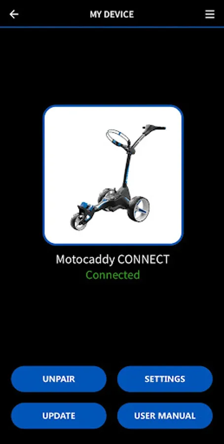 The Motocaddy GPS app has also been developed to allow pairing with any Motocaddy 'CONNECT' trolley model via a Bluetooth® connection on a compatible smartphone; allowing the trolley's screen to display front, middle and back distances to the green along with par of the hole and clock. It also offers a round timer and shot measurement - both fully controllable from the trolley handle, plus optional smartphone notifications.
