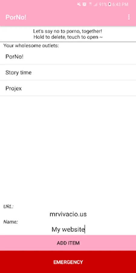To use PorNo!, install the app and add links to sites that inspire you, empower you, encourage you to do great things, to do your best....etc. Sites, articles, videos, music, add whatever!
