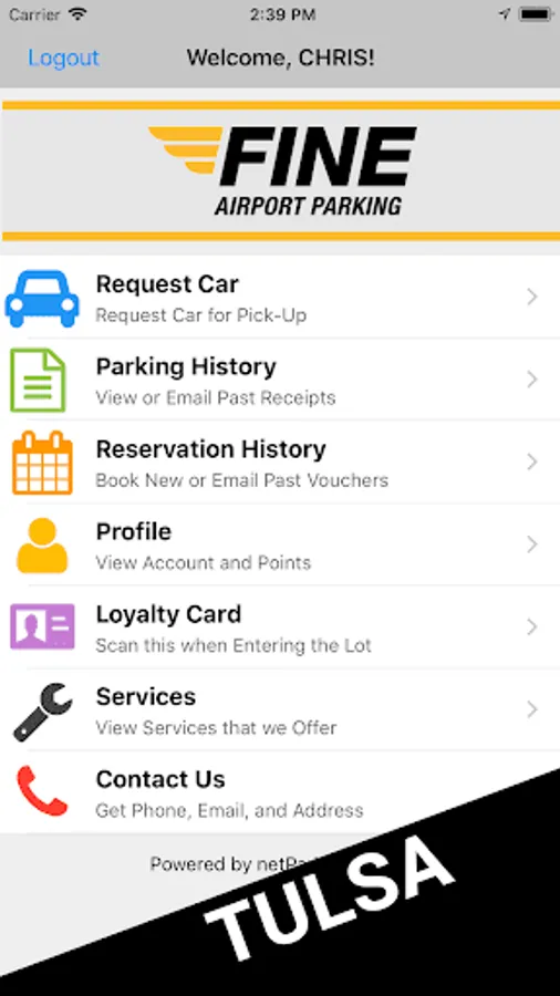 Customer portal for access to Fine Airport Parking located at Tulsa International Airport in Tulsa, OK, providing: