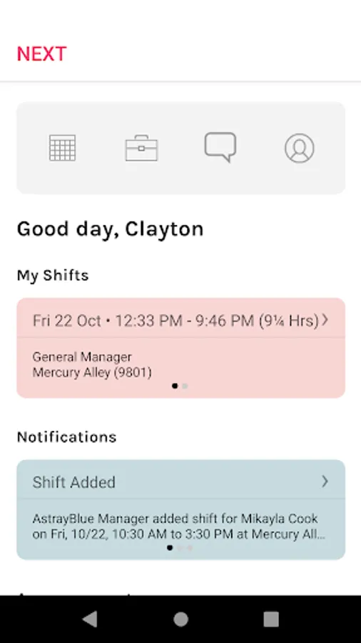 For managers: NEXT for Managers and Crew is your intelligent assistant making sure your team members are able to work all the scheduled shifts.