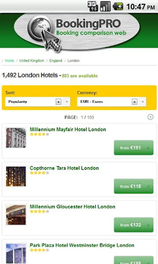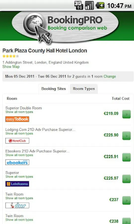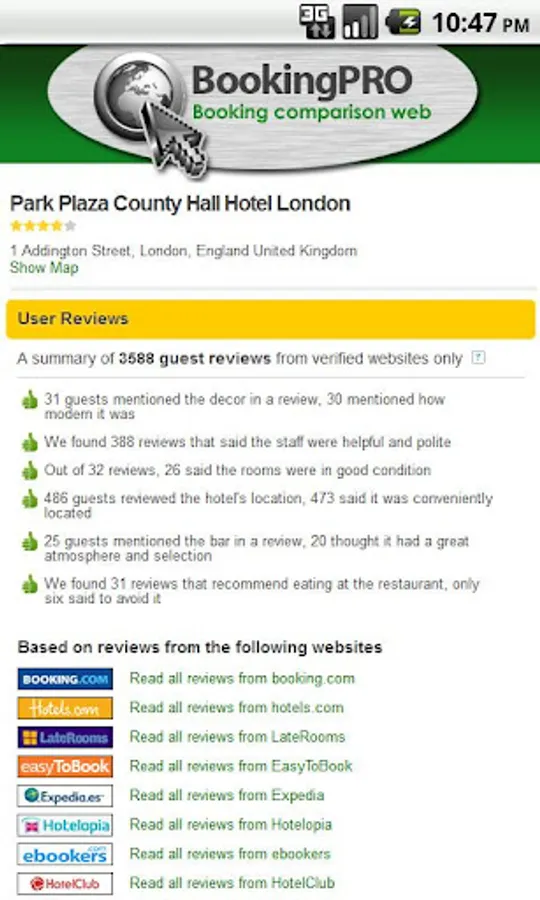 All the power of our Bookingpro engine PLUS: Expedia.com, Venere.com, Lastminute.com, Hotels.com, Easytobook and over 200 websites online with the biggest range of hotels available online is now in the palm of your hand... and it is free.