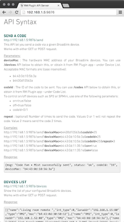 This app acts as a HTTP Bridge and let you control your Broadlink devices via simple HTTP urls (a.k.a curl commands). API syntax are extremely user-friendly and well-documented right inside the app. It is now much easier to integrate RM device into your home automation setup.