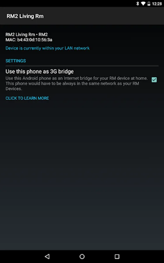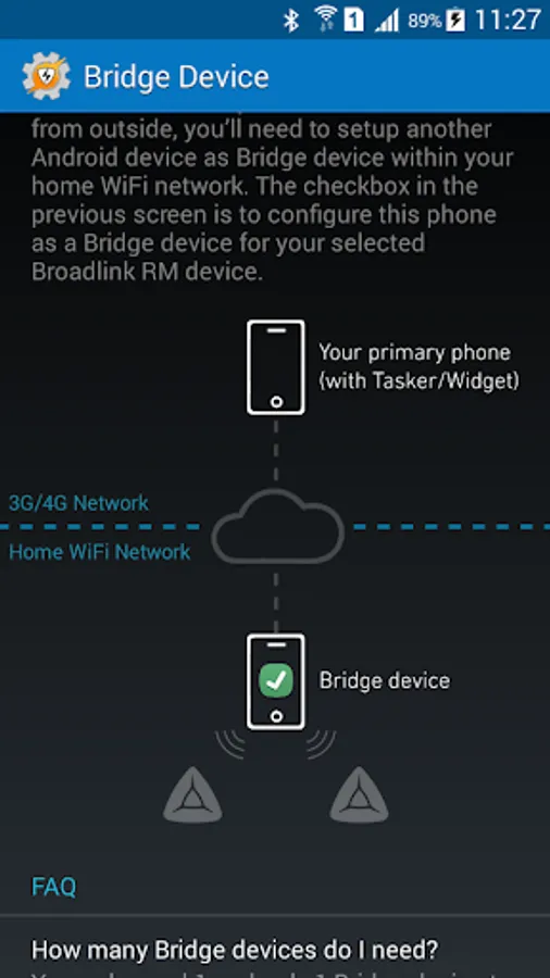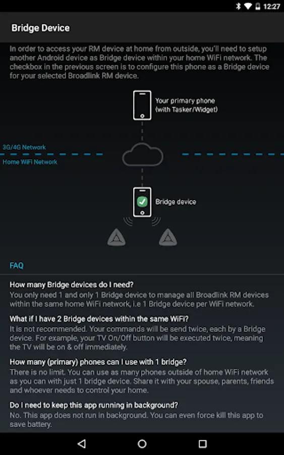 You can control your Broadlink RM devices even from outside of your home WiFi network, as a Tasker plugin or a homescreen widget. You'll simply need to enable a Bridge device within your home WiFi network. Refer to screenshot and in-app FAQ for more details.