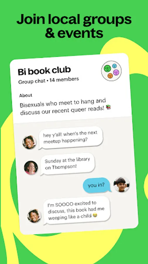 - Join or create a group - chat with local LGBTQ+ community around a shared interest, hobby, or activity