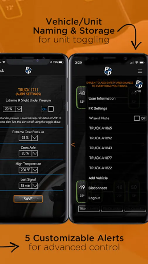 • Vehicle/Trailer Naming and Storage (easy toggling between multiple units)
