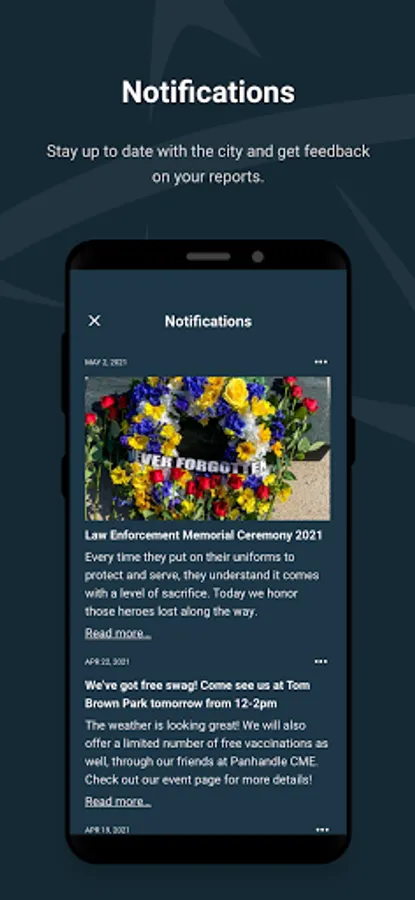 Get emergency alerts and notifications about upcoming events from the city, and get feedback when the city needs to follow up with you.