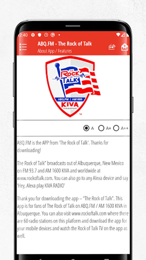 Thank you for downloading the app – “The Rock of Talk”. This app is for fans of The Rock of Talk on ABQ.FM / AM 1600 KIVA in Albuquerque. You can also visit www.rockoftalk.com where there are 60 radio stations on this platform and download the app for your mobile devices and watch the Rock of Talk TV on the app as well.