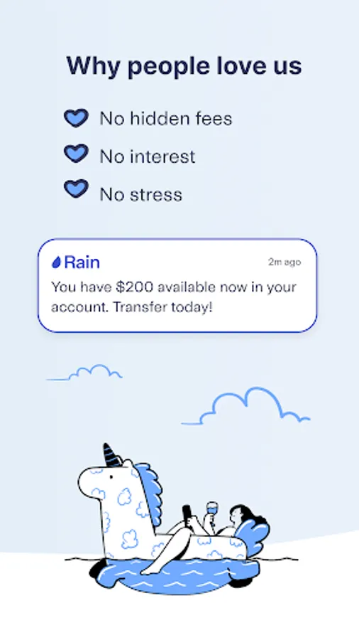 Rain is on a mission to eliminate the need for payday loans, overdraft fees, and high-interest credit cards. With the Rain app, you can easily gain access to a portion of your paycheck before payday! Rain allows you to access the money you’ve already earned, and you can make a request on the Rain app at any time. All you have to do is add a card (any card) to the app and transfer funds from Rain to yourself when you’re ready. Access to the money you’ve already earned reduces stress and makes paying bills easy when you are short on cash.