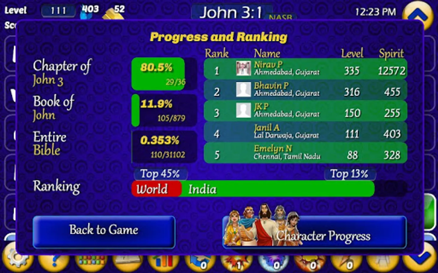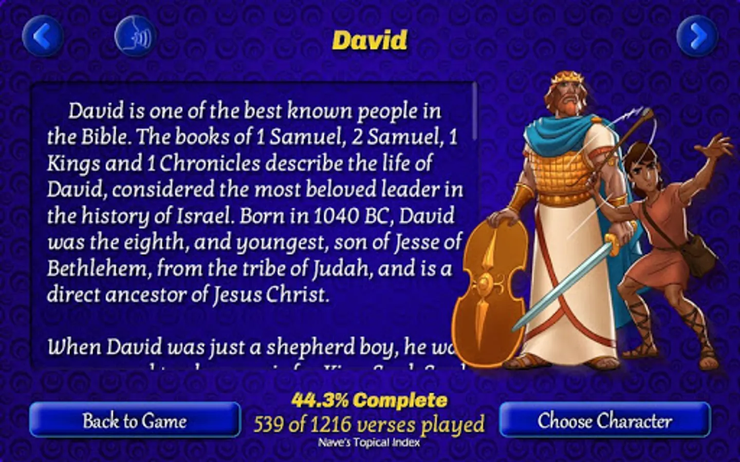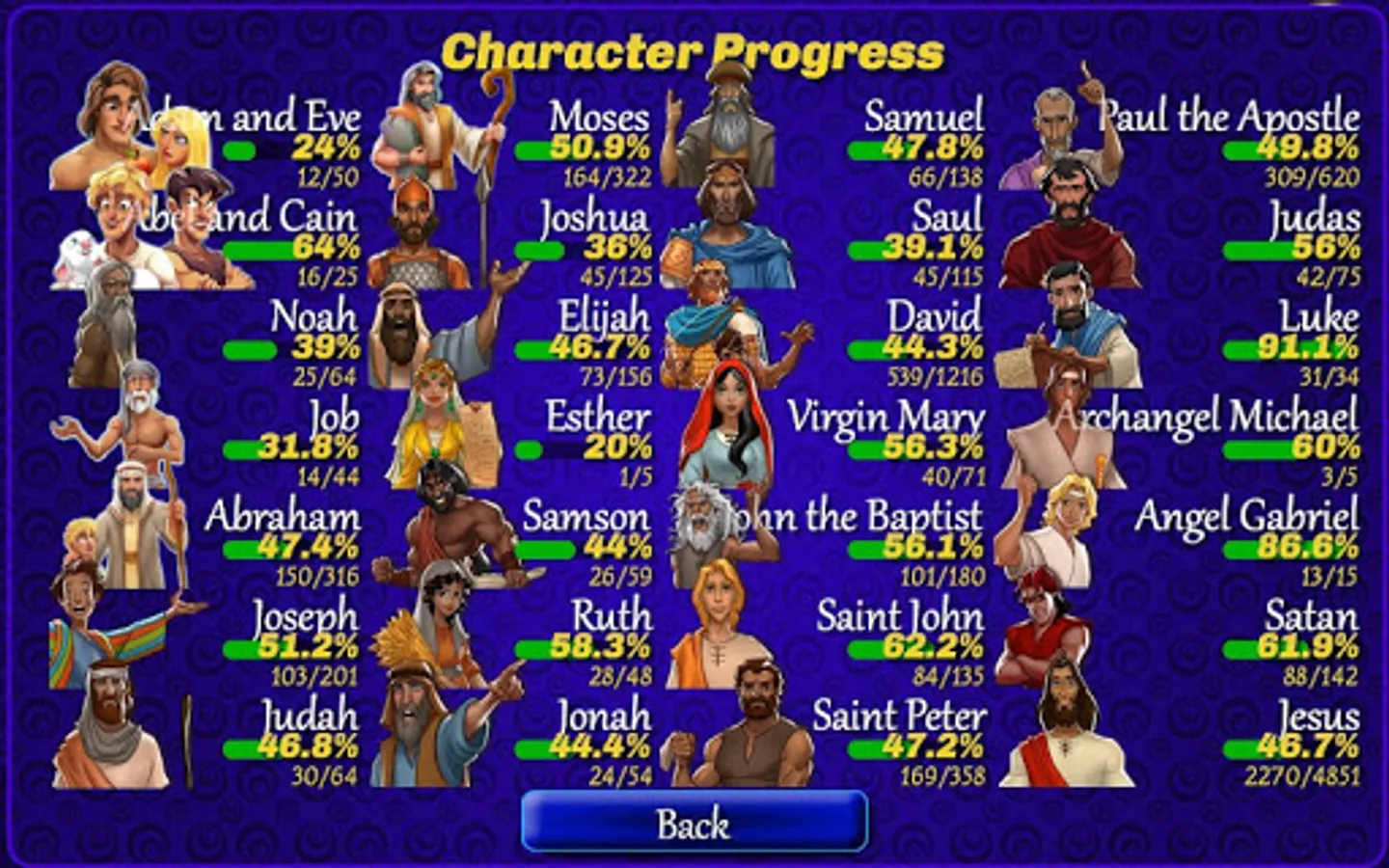 • Character Progress shows you how you are progressing while learning about your favorite characters in each scripture verse
