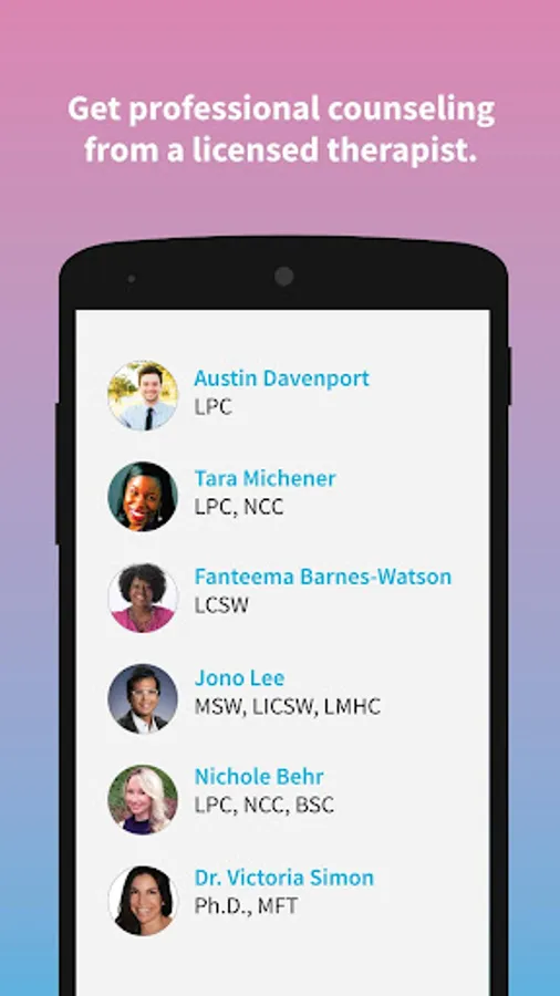 All therapists on Regain have at least 3 years and 1,000 hours of hands-on experience. They are licensed, trained, experienced and accredited psychologists (PhD/PsyD), marriage and family therapists (MFT), clinical social workers (LCSW), licensed professional counselors (LPC), or similar credentials.