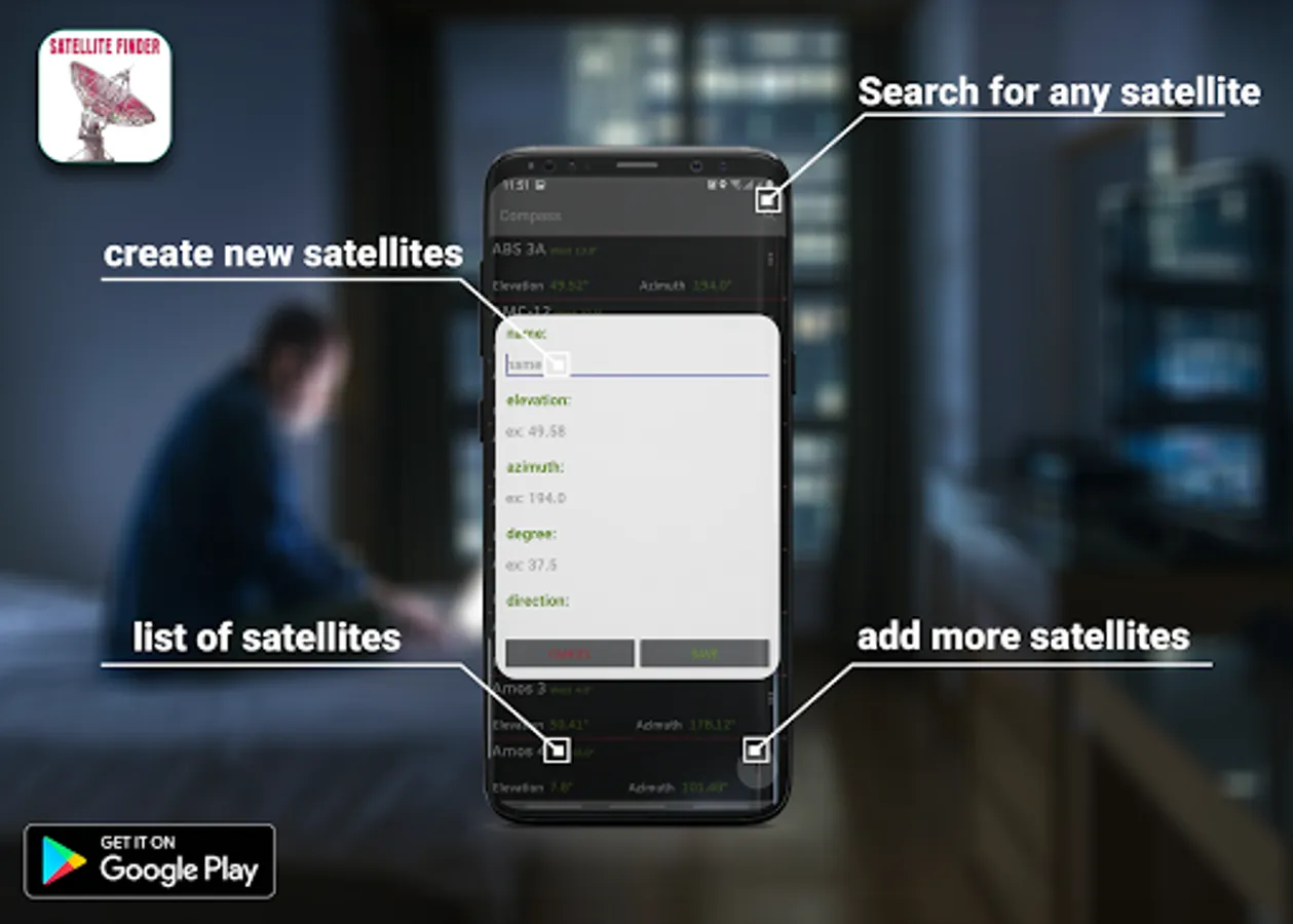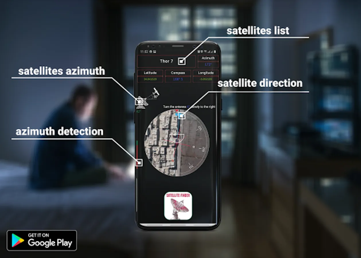 Satellite Finder meter - is a new tool that will help you to set up a satellite dish. SatFinder & Satellite Finder will give you azimuth, elevation, and LNB tilt for your location (based on GPS) and chosen satellite from the list. SatFinder result is shown both as numeric data and graphical on google maps. SatFinder & Satellite Finder meter has also a built-in compass that will help you to find proper satellite azimuth.