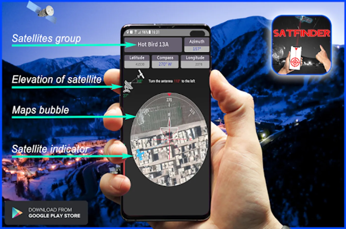 SatFinder - Satellite Finder - is a tool that will help you to set up a satellite dish. SatFinder will give you azimuth, elevation and LNB tilt for your location (based on GPS) and chosen satellite from the list. SatFinder result is shown both as numeric data and graphical on google maps. SatFinder has also built-in compass which will help you to find proper satellite azimuth.