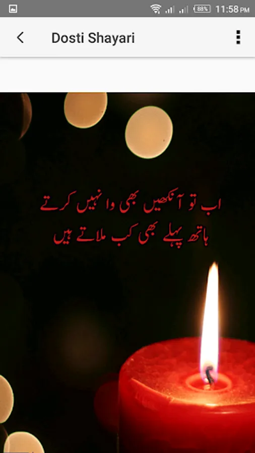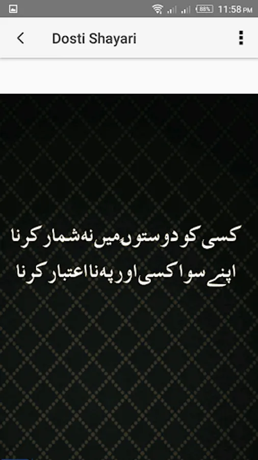 Dosti shayari poori terhan se sachey doston ke liye markooz hai. Ek afrad ke zindagi ke safar mai bahut se salam dua kerne wale log, rishtedar, hum-jamat, yan khel mai log milte hen mager sachey doston ki jaga khas hi hoti hai. Dosti shayari app dostana jazbat ki apne khas dost ki poori terhan akasi kerti hai jo lafzon ka zakhira mukammal tor per inhi ke liye khas bana hai.