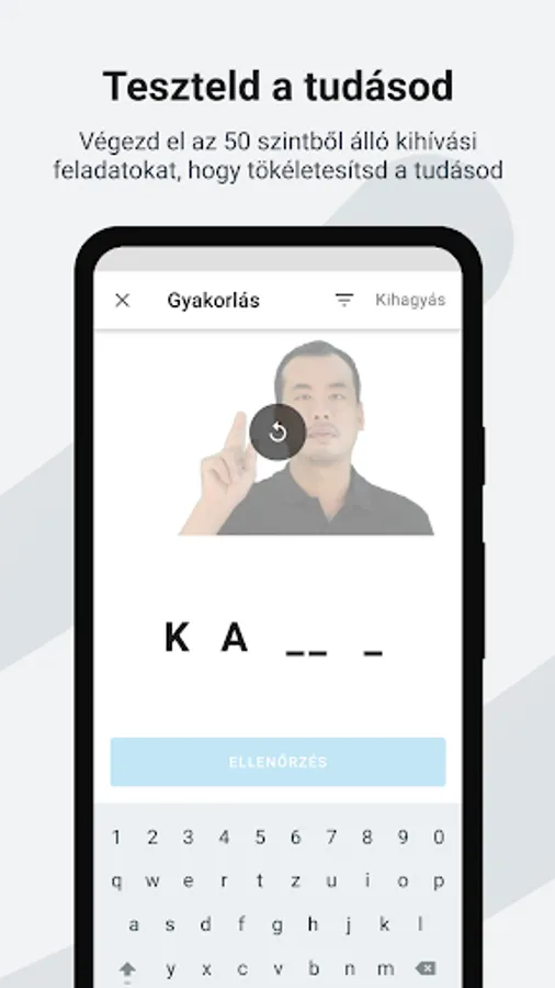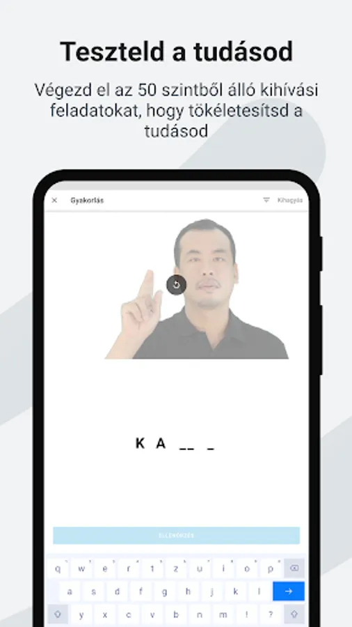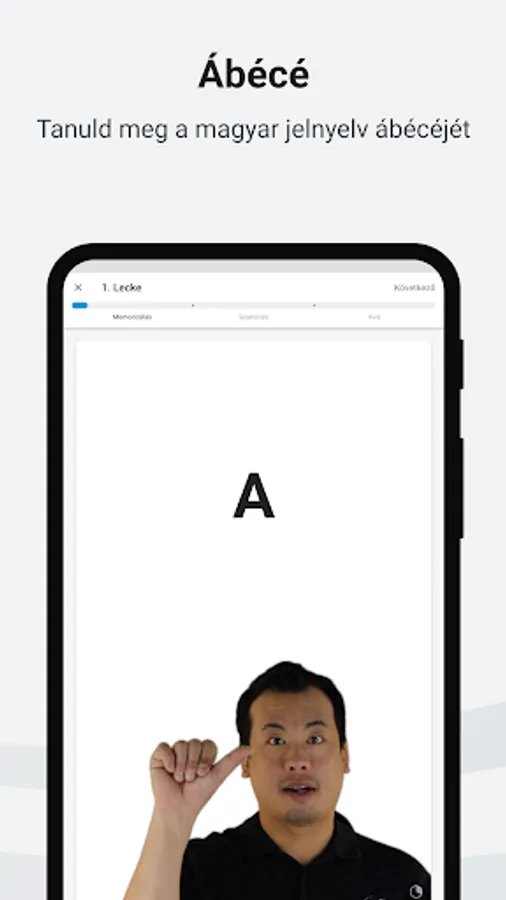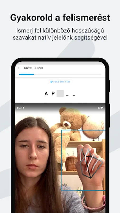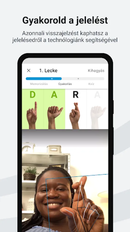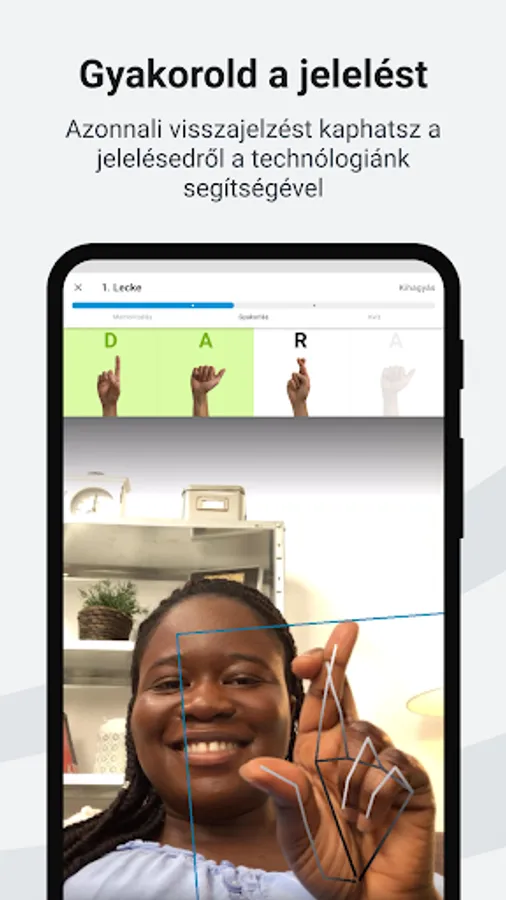 With the help of the application, we can memorize the letters, practice their execution ourselves, as it monitors the user’s hand through the phone’s camera and gives us feedback. We can also improve our recognition skills, that is, our understanding of the spelling shown to us by a signifier. We can test our acquired knowledge along the increasingly difficult challenges in the application.