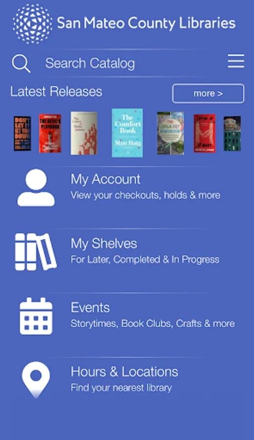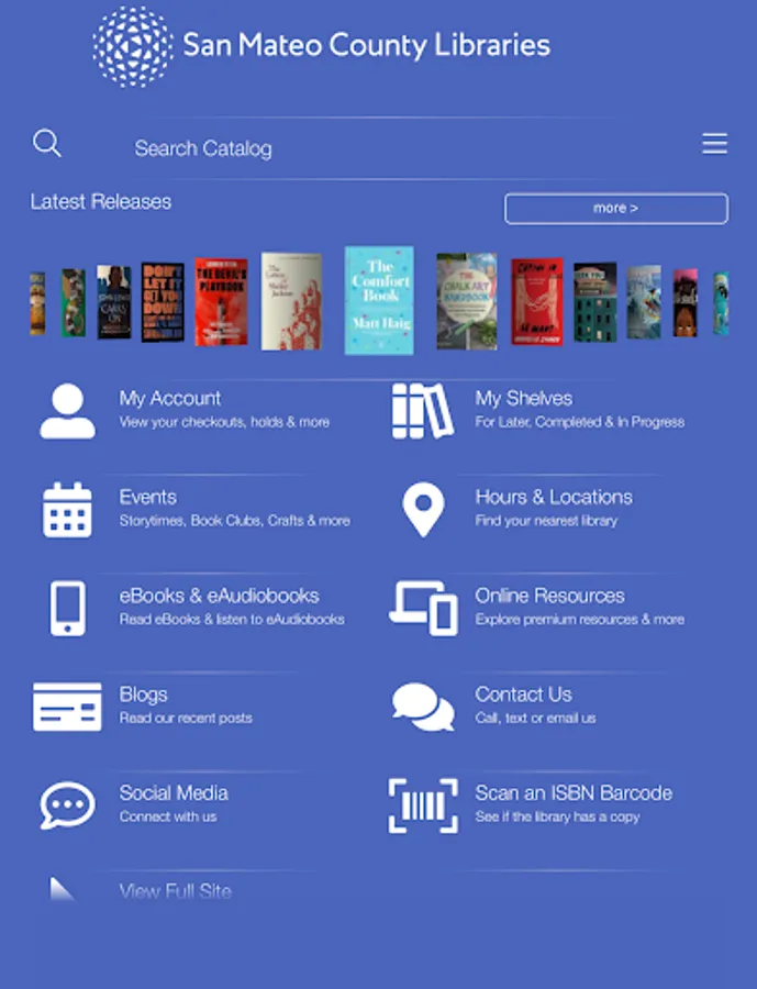 The San Mateo County Libraries app is your connection to the library's services from your mobile device. Check your account, pay fines, renew items, search the catalog, place holds and use your digital library card.
