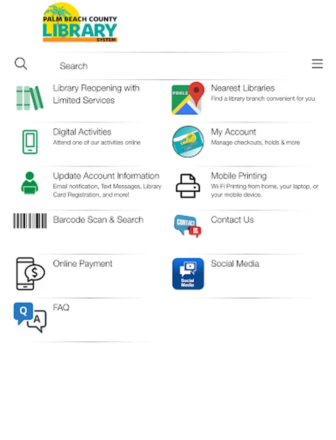 Access Palm Beach County Library from your Android phone or tablet. Manage your account, search the catalog, renew checkouts and place holds.