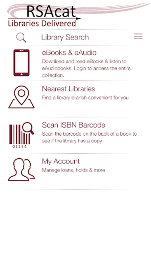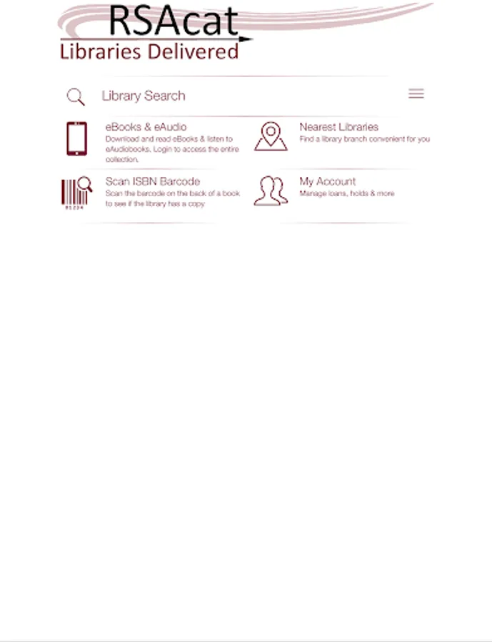 Access RSAcat Mobile Catalog from your Android phone or tablet. Manage your account, search the catalog, renew checkouts and place holds.