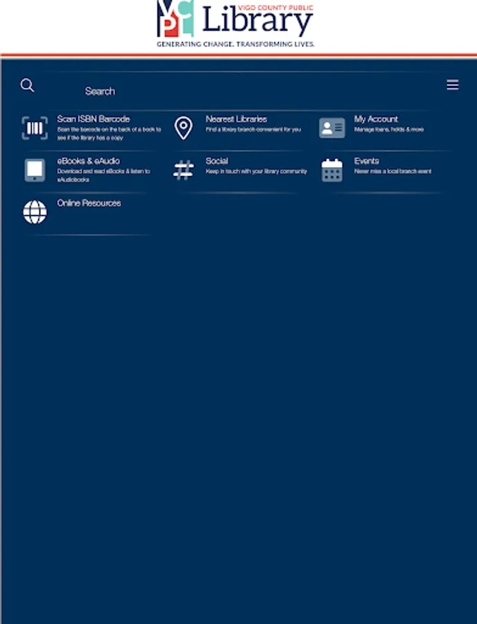 VCPL Mobile lets you connect with the Vigo County Public Library from your favorite device, whenever you want and wherever you are. With VCPL Mobile, you can find your favorite books, movies, ebooks, and more, place and manage holds, and renew your items from your tablet or phone.