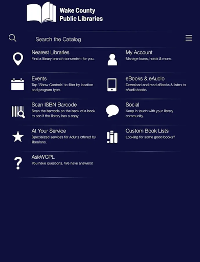 Access Wake County Public Libraries from your Android phone or tablet. Manage your account, search the BRiAN online catalog, renew and reserve books, and access information about library events and services!
