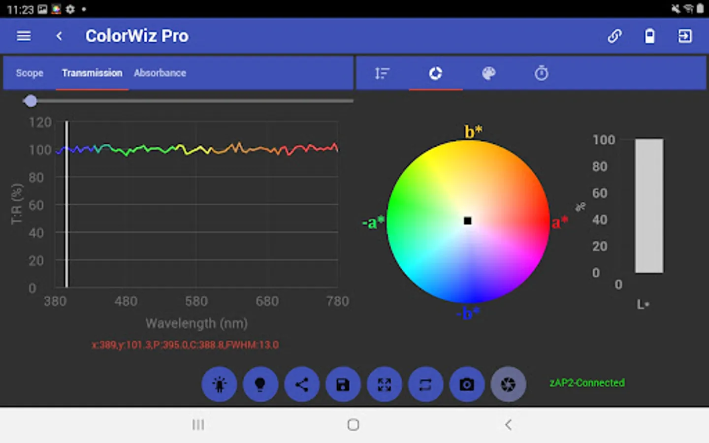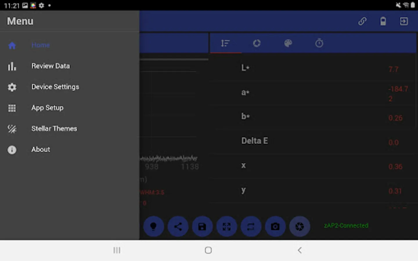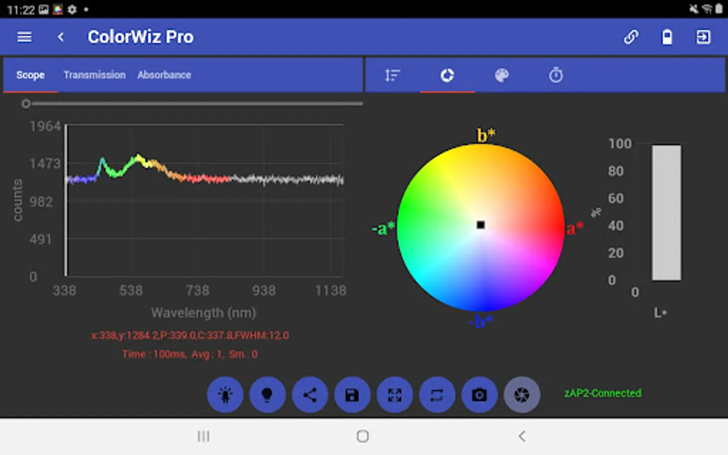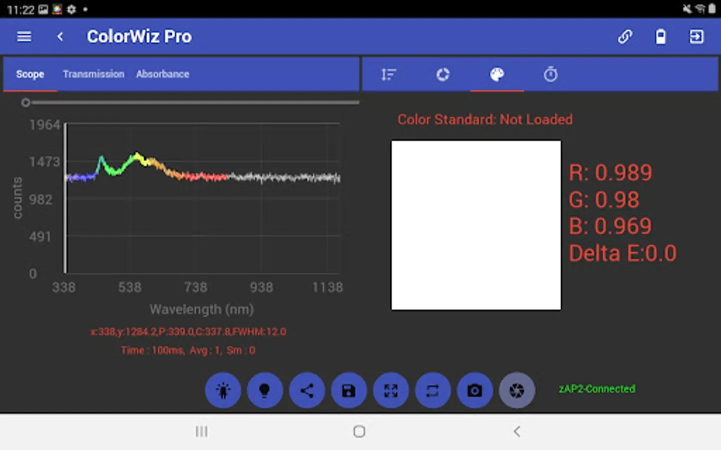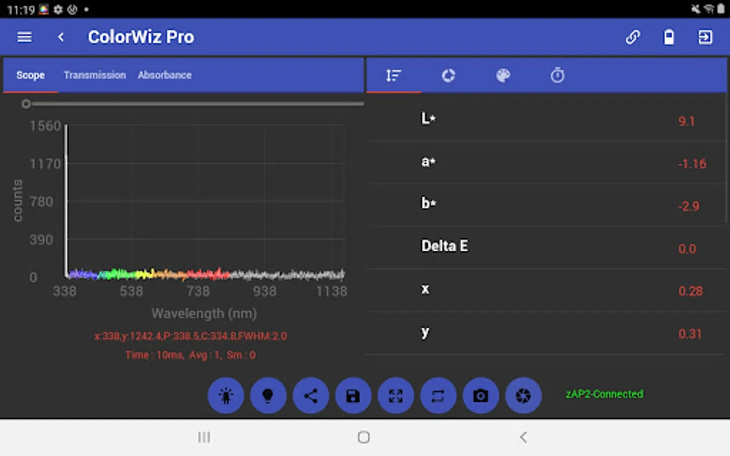 The ColorWiz App for all WiFi enabled StellarNet spectrometers makes real-time color measurement quick and easy. Acquire full spectrum analysis and research grade colorimetry of solids, liquids, and powder samples! This intuitive app lets users control their spectrometer and capture basic and more advanced color measurement parameters such as CIE L*a*b* and RGB. Colorimetric analysis such as Chroma, Hue, Luminosity, SRM, Lovibond, & EBC. Easily save a dE color reference and calculate color differences. Save spectra, color metrics, and export as .TRM or .ABS text data file, screenshot, and/or PDF report with all parameters listed.