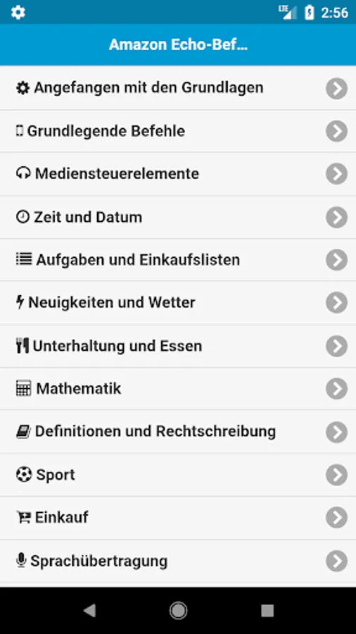 Komplette Liste der Amazon Alexa / Echo Befehle. Alles, was Alexa für dich tun kann. Amazon Echo ist ein Freisprech-Lautsprecher, den Sie mit Ihrer Stimme steuern können. Echo stellt eine Verbindung zum Alexa Voice Service her, um Musik abzuspielen, Informationen, Nachrichten, Sportergebnisse, Wetter und mehr bereitzustellen. Die Alexa-Plattform ist voller erstaunlicher Fähigkeiten und Funktionen, die nur darauf warten, dass Sie sie aktivieren und testen. Mit dieser App können Sie alle Dinge kennen, die Alexa für Sie tun kann.