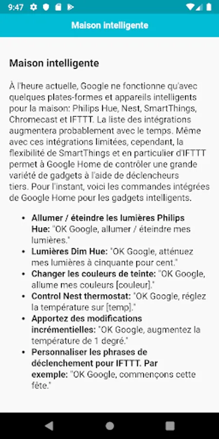Depuis cette application, vous obtiendrez toutes les commandes vocales essentielles pour Google Home. Qu'il s'agisse de contrôler vos lumières connectées ou d'obtenir des informations sur votre acteur préféré, Google Home, optimisé par le nouvel assistant Google, a certainement de nombreux trucs à son actif. Si vous souhaitez attirer l’attention de votre Google Home, dites simplement «OK Google» ou «Hé Google». Et commencez par demander quoi que ce soit.