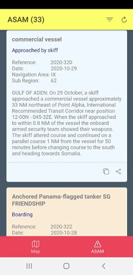 Anti-shipping Activity Messages (ASAM) include the locations and descriptive accounts of specific hostile acts against ships and mariners. The reports may be useful for recognition, prevention, and avoidance of potential hostile activity.
