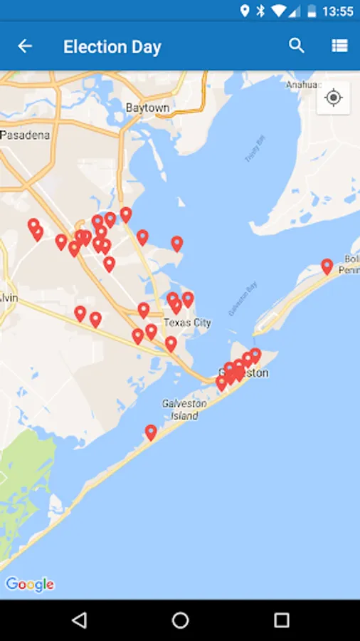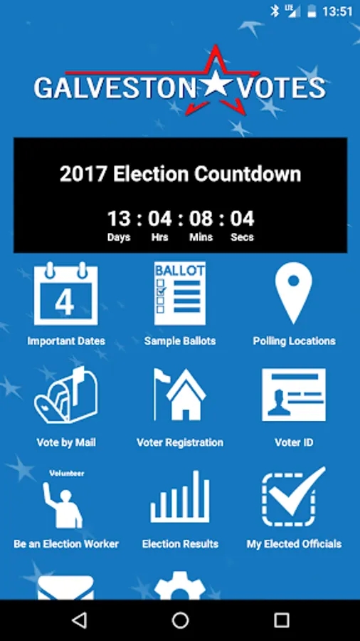 The GalvestonVotes App provides information on election dates and times; interactive maps showing voters their nearest Voting Location along with directions on how to get there; and information on countywide voting, ID requirements, and how to contact Galveston County Elections. There are also sample ballots, an election calendar, and election return information on Election Night.
