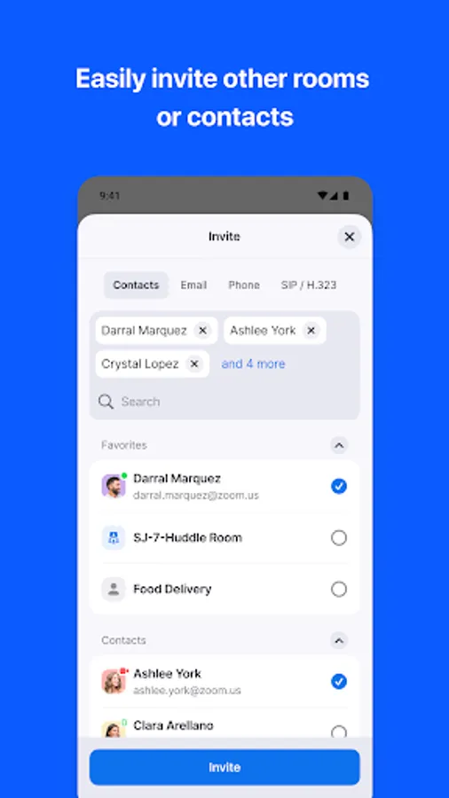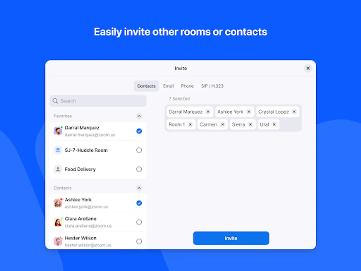 ● Connect with anyone using Zoom Rooms, Android, iOS, Windows, Mac, SIP/H.323 room systems, telephones, and other devices