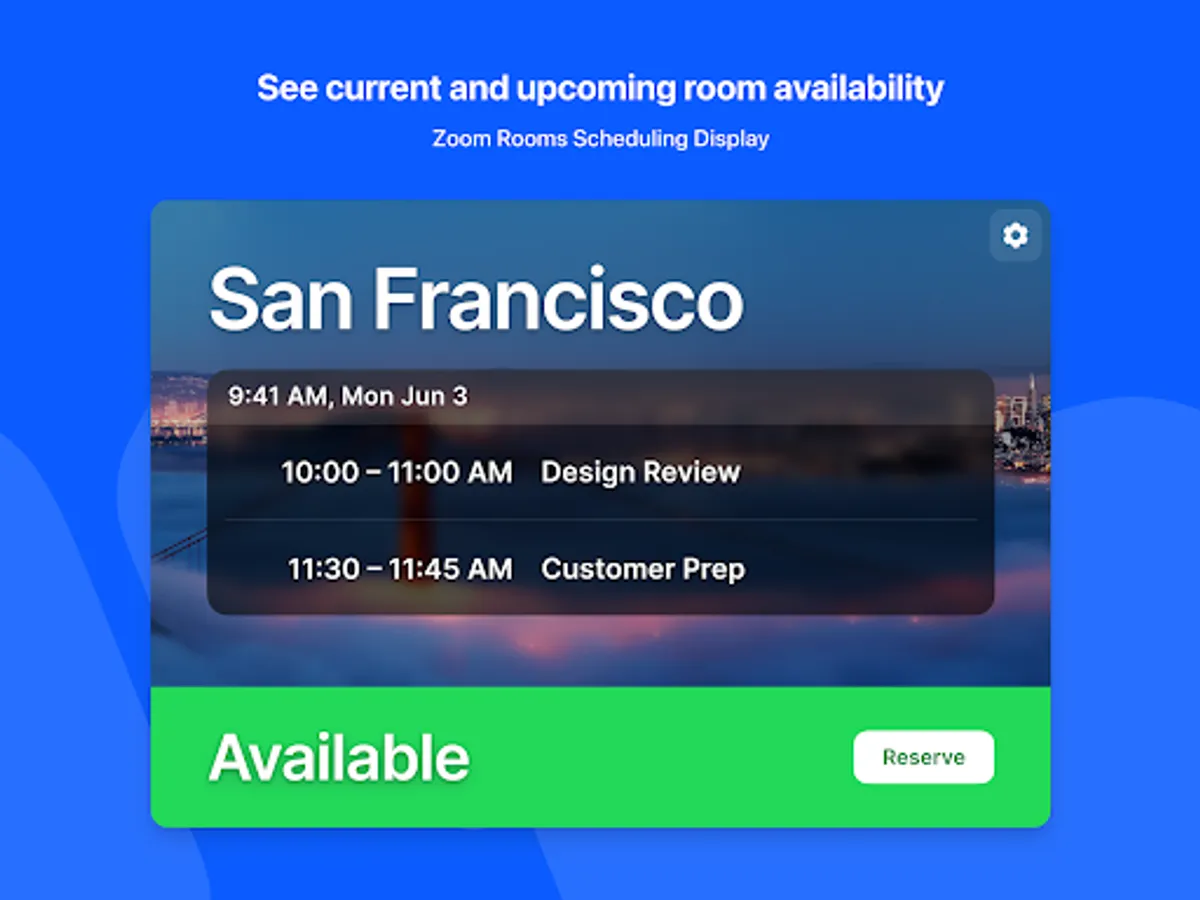 The tablet screen can be switched to the Scheduling Display mode and placed outside the room to show current availability, display upcoming meetings, and allow you to reserve time for an instant Zoom meeting.