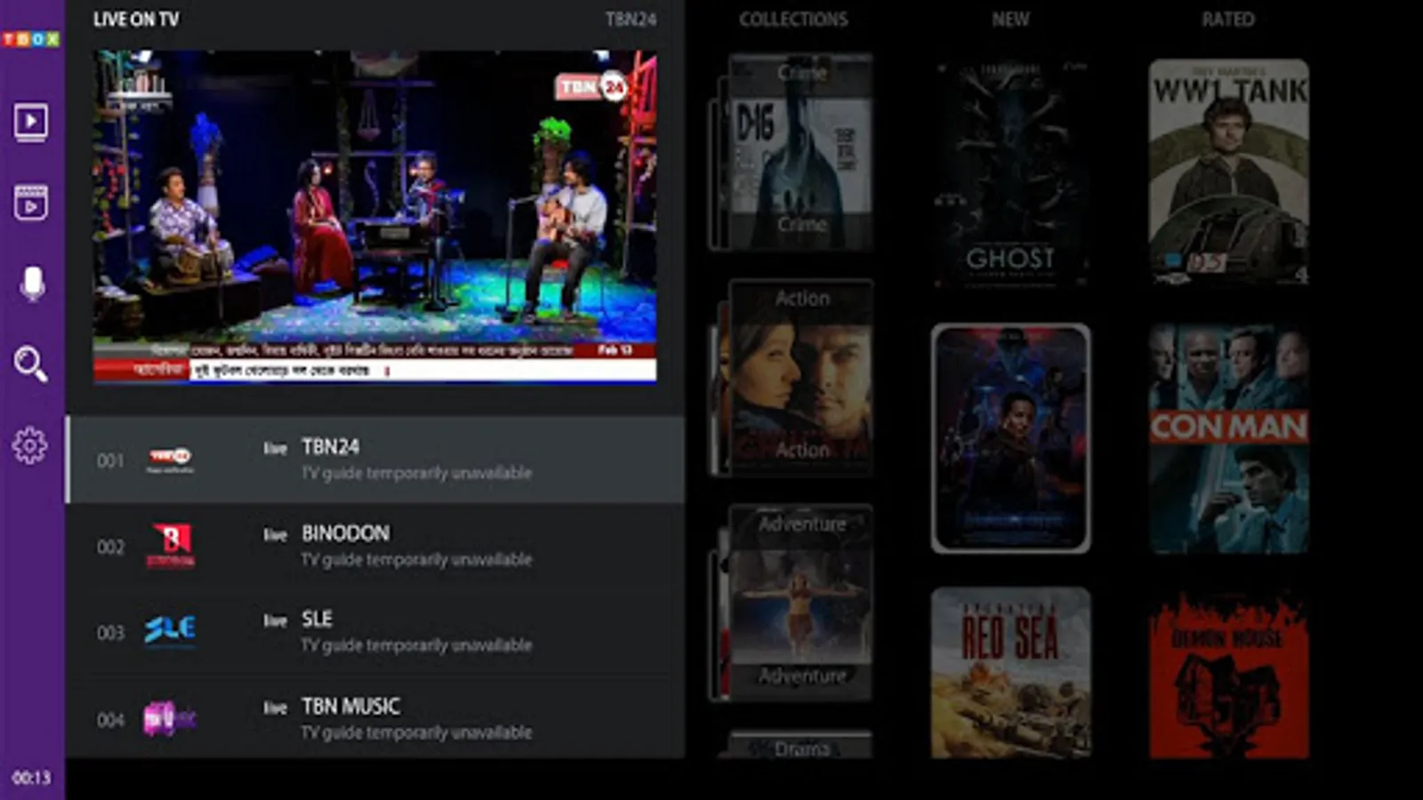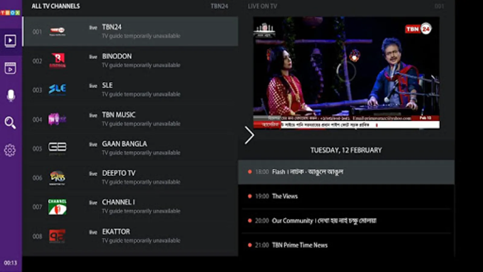 TBOX TV app for Android SmartTV offers the largest selection of Deshi programming - video on demand and live television channels. An extensive video-on-demand library includes movies, television shows, documentaries, and sports highlights.