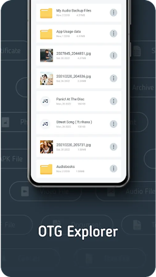 1. Audios :- The OTG File Explorer or USB Connector or OTG Connector Software For Android allows you to manage all Audio Files. You can Cut, Copy, Paste or Rename any audio file to and from OTG or USB Driver.