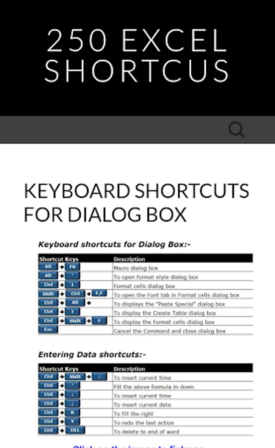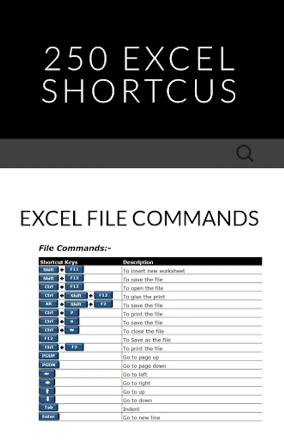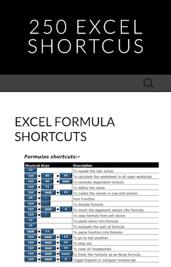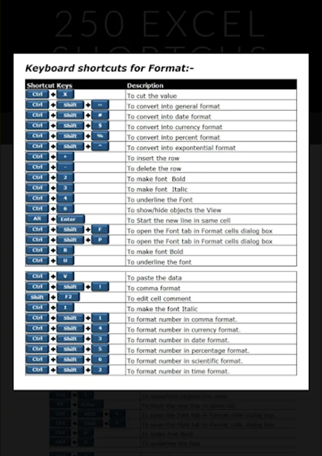 250 Excel Shortcuts - application provides you Basic and Advanced shortcut keys in Excel,