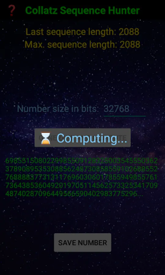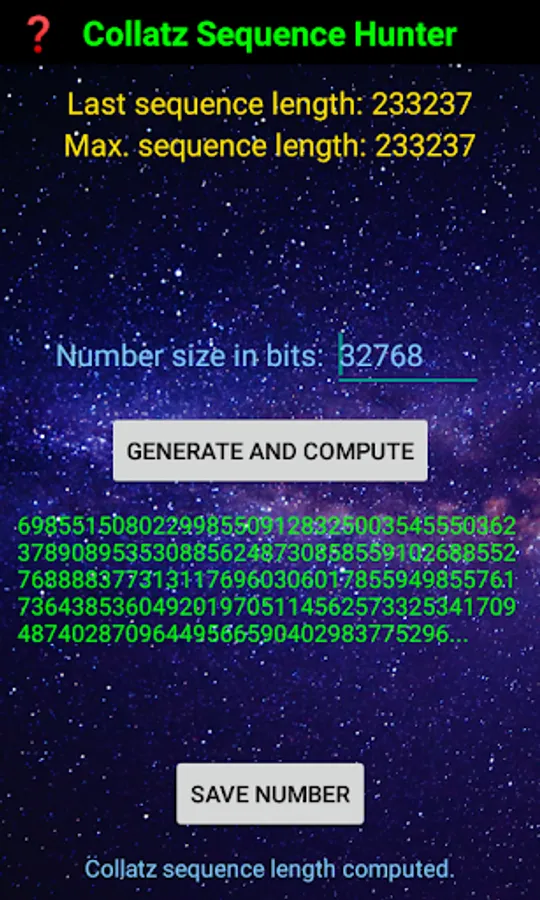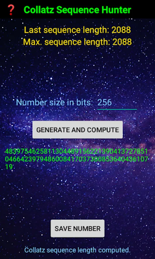 Collatz Sequence Hunter app will generate a random starting number up to 8192 bits long, equivalently up to 2^8192 or approximately up to 10^2466. Subsequently, the Collatz sequence is computed until 1 is reached. For the largest numbers allowed, this usually takes a few minutes at most. The sequence length from the start until 1 is reached is recorded. The last and maximum sequence lengths are displayed.