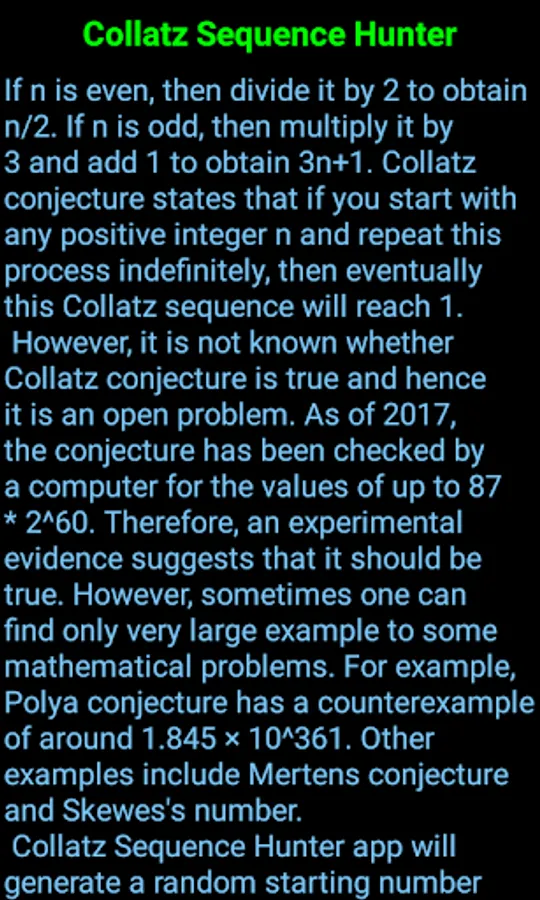 However, it is not known whether Collatz conjecture is true and hence it is an open problem. As of 2017, the conjecture has been checked by a computer for the values of up to 87 * 2^60. Therefore, an experimental evidence suggests that it should be true. However, sometimes one can find only very large example to some mathematical problems. For example, Pólya conjecture has a counterexample of around 1.845 × 10^361. Other examples include Mertens conjecture and Skewes's number.