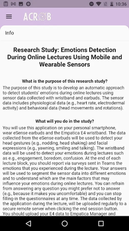ACROB app connects and collects data from accelerometer and gyroscope sensors embedded in eSense earbuds (https://www.esense.io/). Accelerometer and gyroscope show information regarding user's head movements and rotations in three dimensions (e.g., x, y, z). The collected data are stored locally and then uploaded remotely to SWITCHDrive (https://www.switch.ch/drive/).