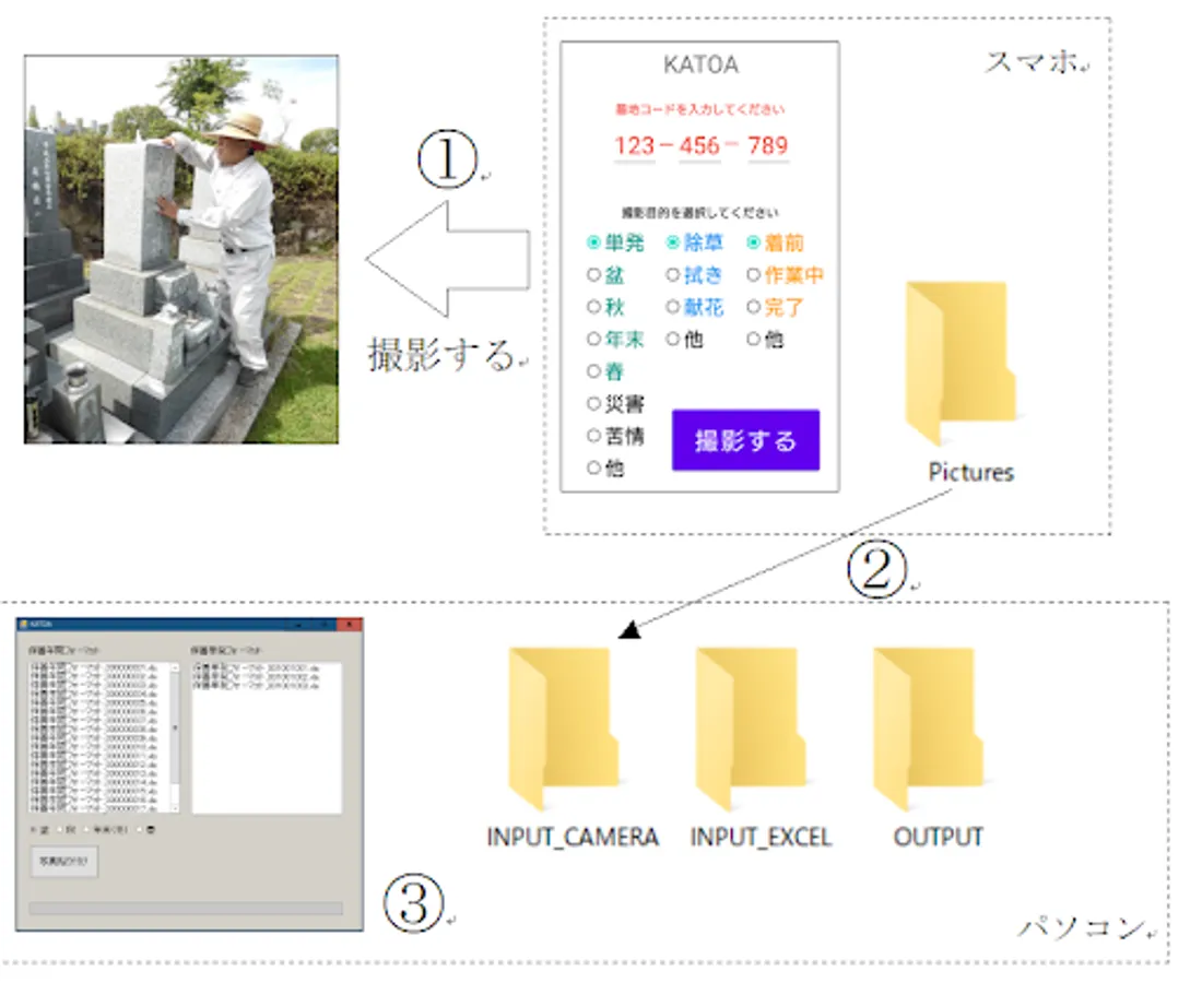 KATOA is software for pasting work photos of weeding, wiping, and flower donation on a report for the purpose of protecting the grave. With KATOA, even if you have a large number of reports and photos to be pasted on them, you can paste the photos into the report in a short time.