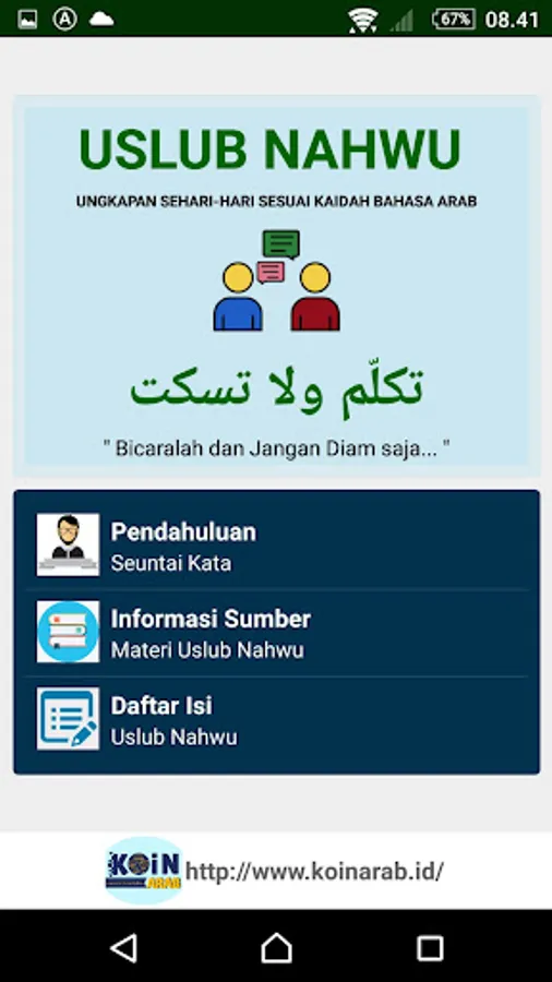 This Nahwu Uslub material was taken from FB Coin, Arabic Coin Telegram, and also the download of the e-book uslub nahwu book (an expression in Arabic according to the nahwu rules) into pdf form by Dr. Nasaruddin Idris Jauhar, M.Ed. (Lecturer of UIN Sunan Ampel Surabaya) compiled by the late Muhammad Fathoni Abu Faiz Al-Falimbani and also the late Ibrohim Abdul Shidiq, S.T.