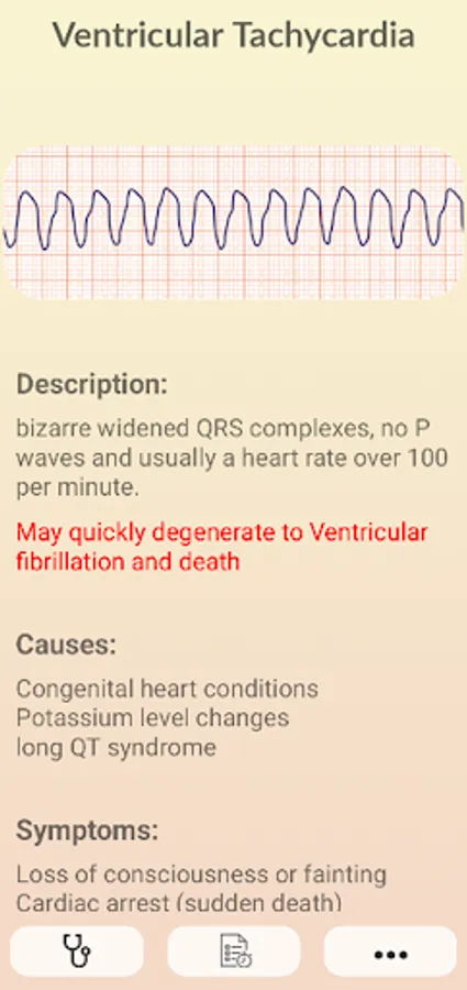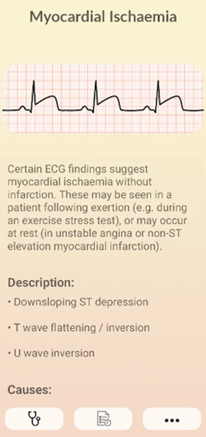 After learning to read an ECG, you can scroll down and learn the causes of that abnormality and the situations where it arises. You'll also learn the medical treatments and complications.