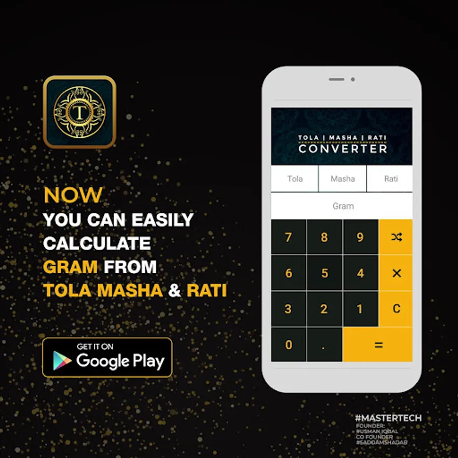 An Android Converter app "Grams to Tola Masha Rati Converter" facilitate the user to convert grams values to Tola Masha and rati. Similarly using this app one also convert Tola , Masha and Rati values to equivalent grams value.