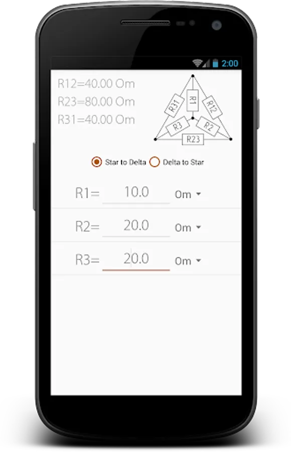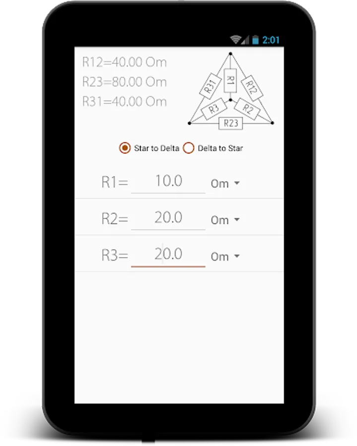 Equivalent transformation of a triangle and a resistance star. Calculation of the voltage divider. Resistance calculation for the LED