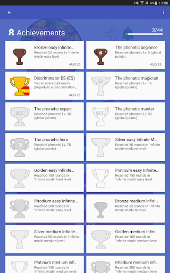 - 4 game modes: exhibition, discrimination, pronunciation and infinite mode.