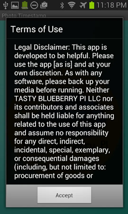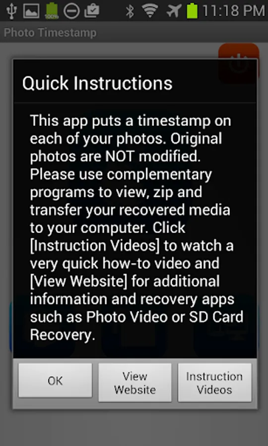 This app creates a copy of all your photos, then puts a timestamp on them. Originals are never modified.