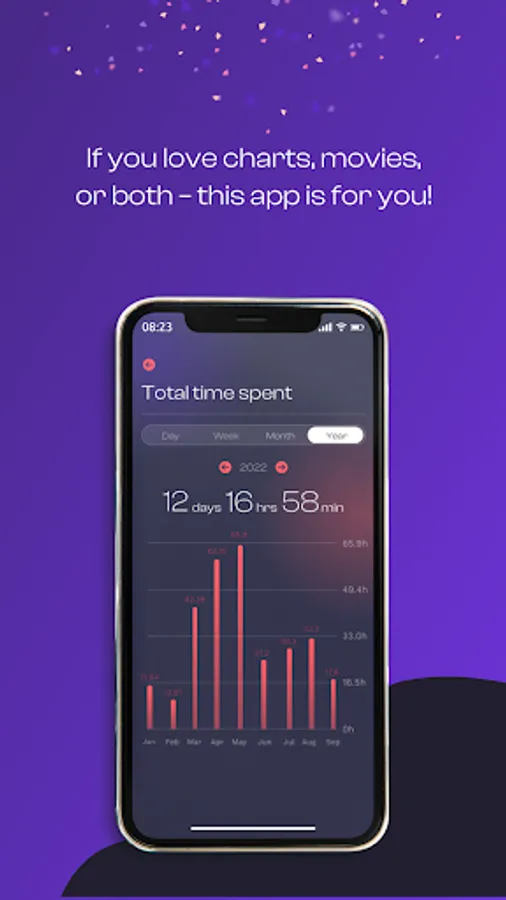 The ""Your time spent today / Total time spent"" screen displays a bar chart with the option to display data from a day, week, month, or year. It shows the total time spent watching titles for a given year, such as 2020 or 2022, not 365 days.