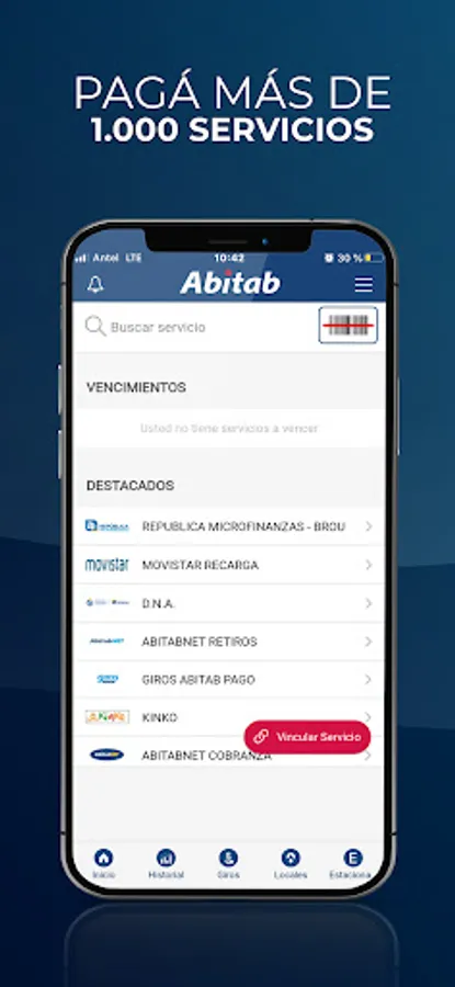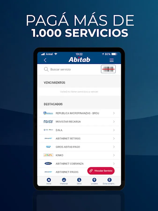You have an Abitab one click away! More than 1,000 services linking your Prex prepaid card, Cabal, ANDA or PassCard credit cards. You can also use your AbitabNET account or Tu Caja Abitab*.