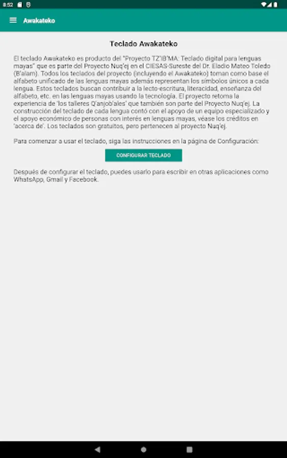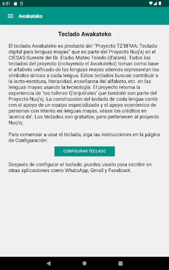 The Awakateko keyboard is a product of the "TZ'IB'MA Project: Phonemic digital keyboard for Mayan languages" which is part of the Nuq'ej Project at CIESAS-Southeast of Dr. Eladio Mateo Toledo (B'alam) in collaboration with a team of Awakateko speakers.