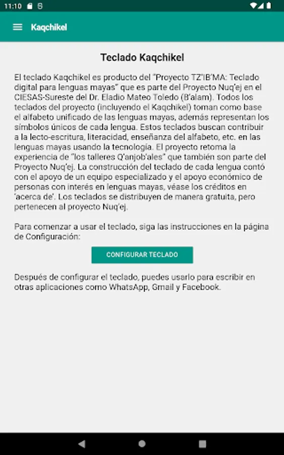 The Kaqchikel keyboard is a product of the "TZ'IB'MA Project: Phonemic digital keyboard for Mayan languages" which is part of the Nuq'ej Project at CIESAS-Southeast of Dr. Eladio Mateo Toledo (B'alam) in collaboration with a team of Kaqchikel speakers.