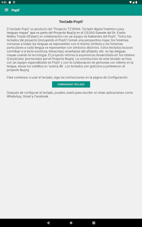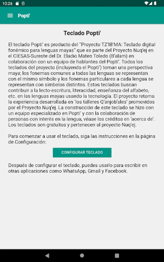 The Popti' keyboard is a product of the “TZ'IB'MA Project: Phonemic digital keyboard for Mayan languages” which is part of the Nuq'ej Project at CIESAS-Southeast of Dr. Eladio Mateo Toledo (B'alam) in collaboration with a team of Popti' speakers.