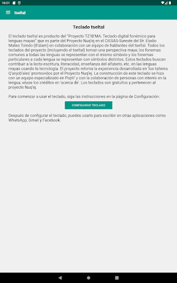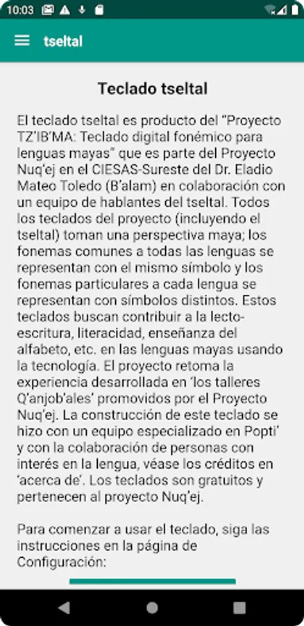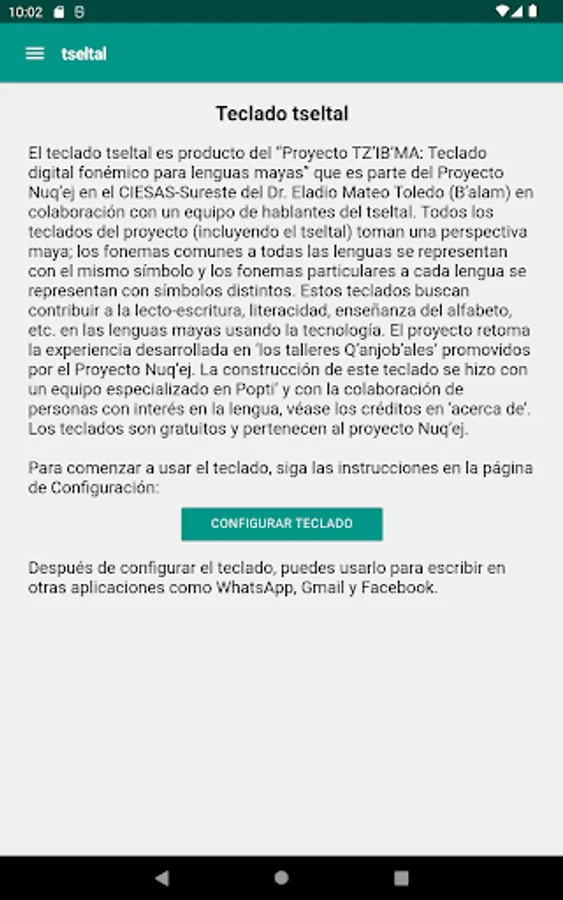 The Tzeltal keyboard is the product of the “TZ'IB'MA Project: Phonemic Digital Keyboard for Mayan Languages” which is part of the Nuq'ej Project at CIESAS-Sureste of Dr. Eladio Mateo Toledo (B'alam) in collaboration with a team of Tzeltal speakers.