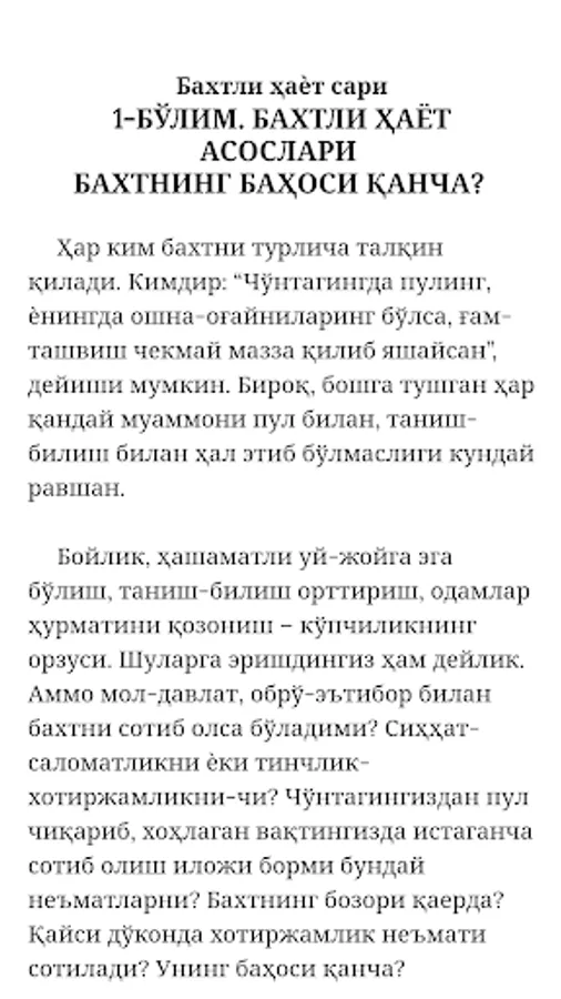 Baxtli bo'lish! Ushbu kitobda siz Baxtli bo'lsih uchun nimalar qilish kerak Baxt nima o'zi shu kabi savolarga javob topa olasiz degan umiddamiz va bu kitob albatta bepul. Hayotda to'g'ri yashash, halol pul topish haqida, baxtiyor oila qurish kitobi.